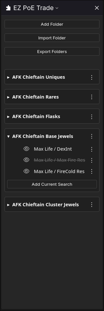 EZ PoE Trade est une extension pour Firefox, conçue pour améliorer l'expérience de commerce dans le jeu Path of Exile. Cet outil permet aux utilisateurs d'organiser efficacement leurs dossiers de commerce, facilitant ainsi l'importation et l'exportation d'informations liées aux échanges. Grâce à son interface intuitive, les joueurs peuvent accéder rapidement à leurs offres et gérer leurs ressources de manière optimale.